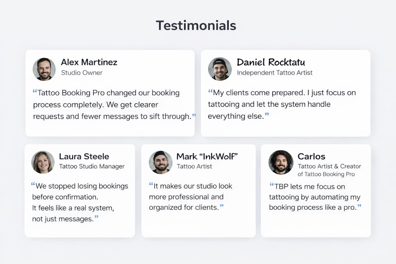 Tattoo Booking Pro saves hours of back-and-forth, prevents pricing mistakes, and filters serious clients.