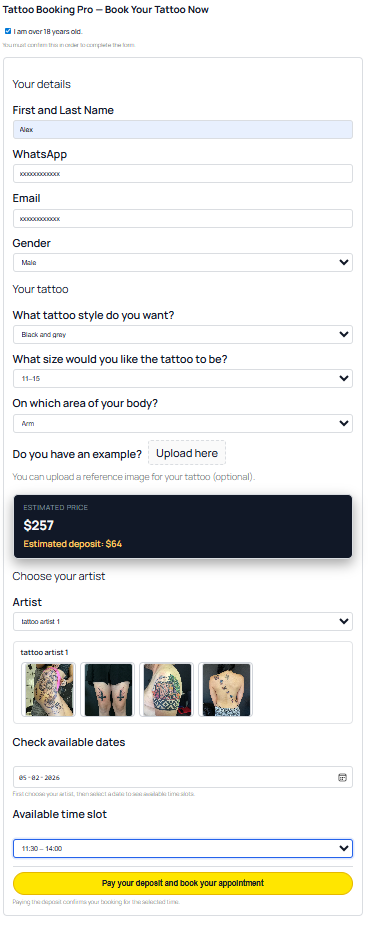 Tattoo Booking Pro guides clients step by step to define their tattoo, see the real price, and reserve their session with online payment — without your intervention.