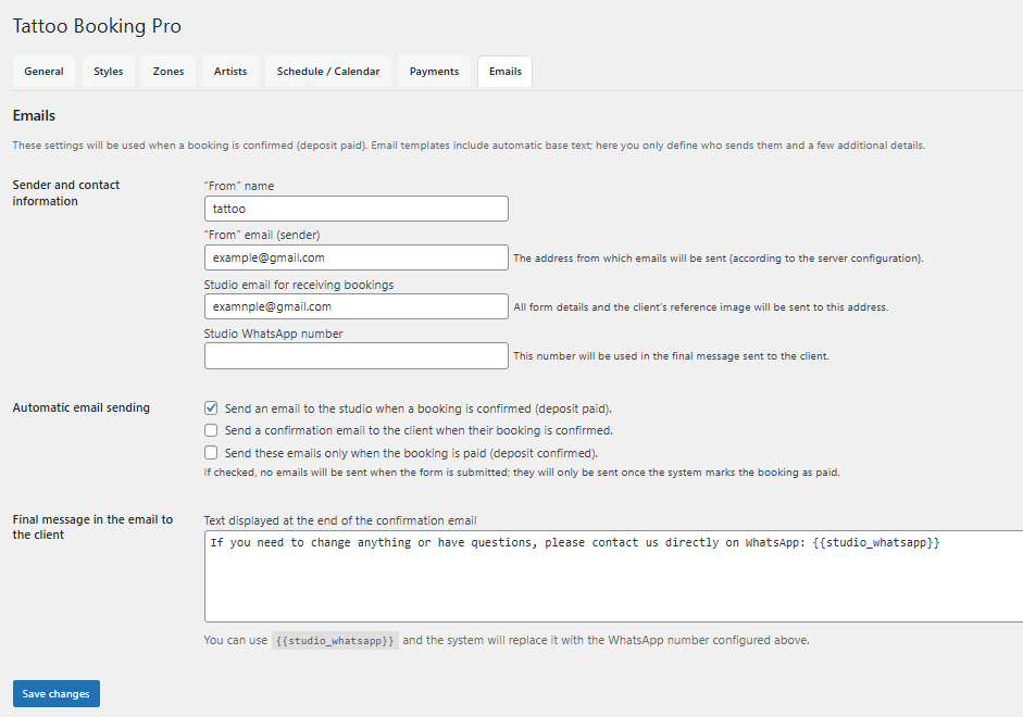 Tattoo Booking Pro sends automatic emails when a booking is created or confirmed.