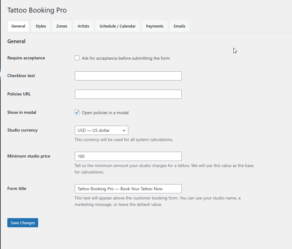 This section explains the main configuration options that control how Tattoo Booking Pro works in your studio.