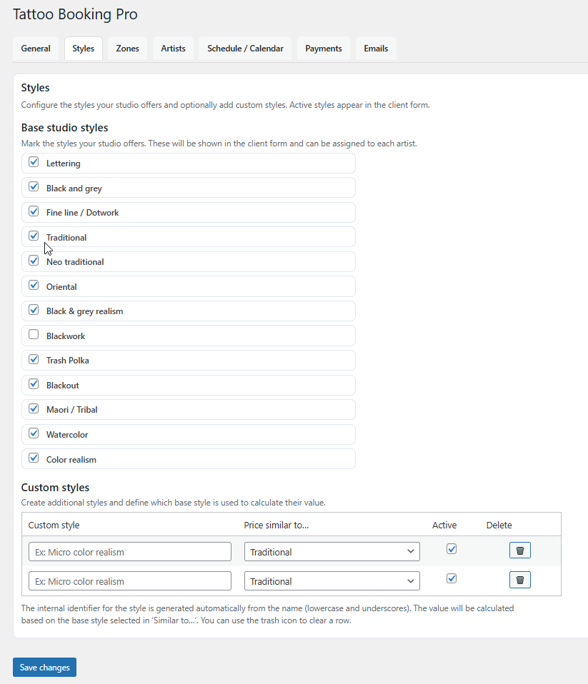 Styles allow you to define the types of tattoos you offer and how pricing behaves for each one.